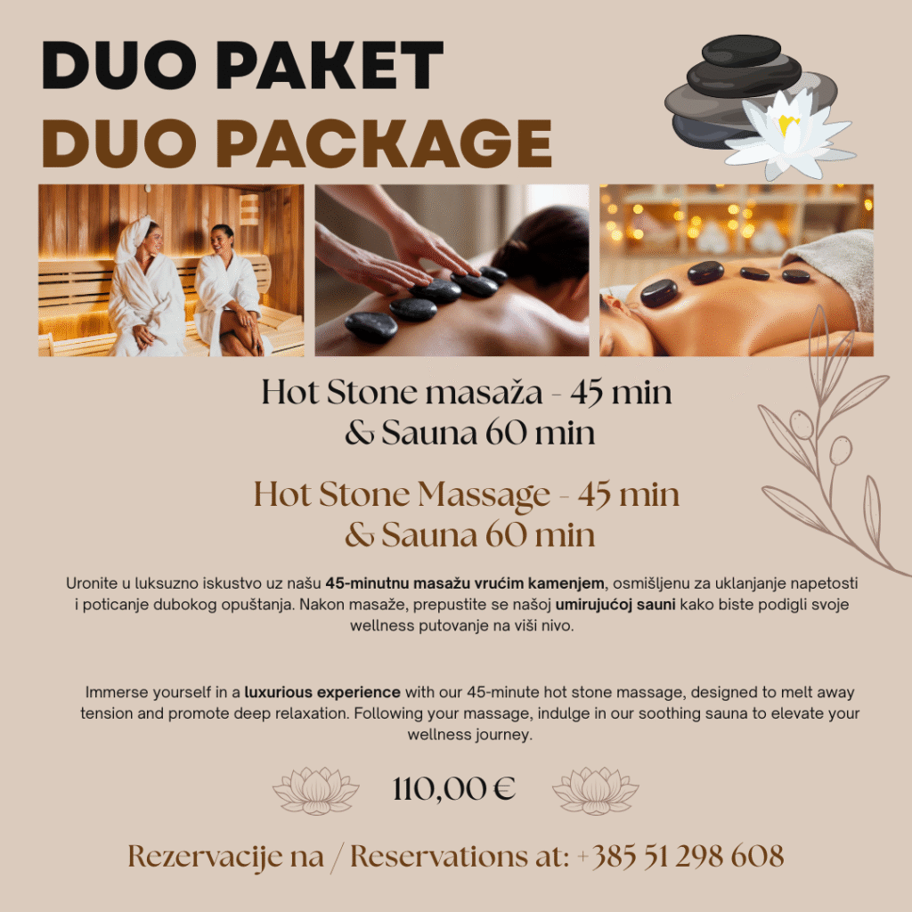 Treat yourself to a massage that will relieve your stress and have a beneficial effect on your body and mind. Hot stone, aromatherapy, and body & face bliss are just some of the massage treatments that you can enjoy during your stay in the Hotel Malin. The massages are based on techniques that will help you relax your muscles, relieve tension, boost your circulation and remove fatigue.